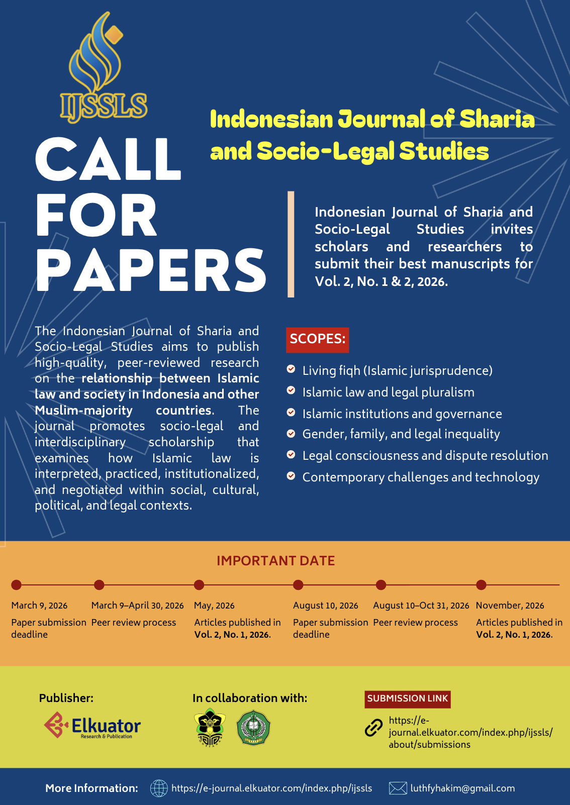 The Indonesian Journal of Sharia and Socio-Legal Studies invites scholars and researchers to submit their best manuscripts for Vol. 2, No. 1 & 2, 2026. All articles should address the topical issues on the dynamic relationship between Islamic law and society in Indonesia and other Muslim-majority countries. The journal promotes socio-legal and interdisciplinary scholarship that critically examines how Islamic law is interpreted, practiced, institutionalized, and negotiated within diverse social, cultural, political, and legal contexts. It welcomes contributions from scholars and practitioners employing socio-legal, empirical, and interdisciplinary approaches, with particular attention to living fiqh (Islamic jurisprudence) and everyday legal practices; Islamic law and legal pluralism; Islamic institutions, governance, and authority; gender, family, and legal inequality; legal consciousness and dispute resolution; as well as contemporary challenges and technologies shaping legal practices in Muslim societies.