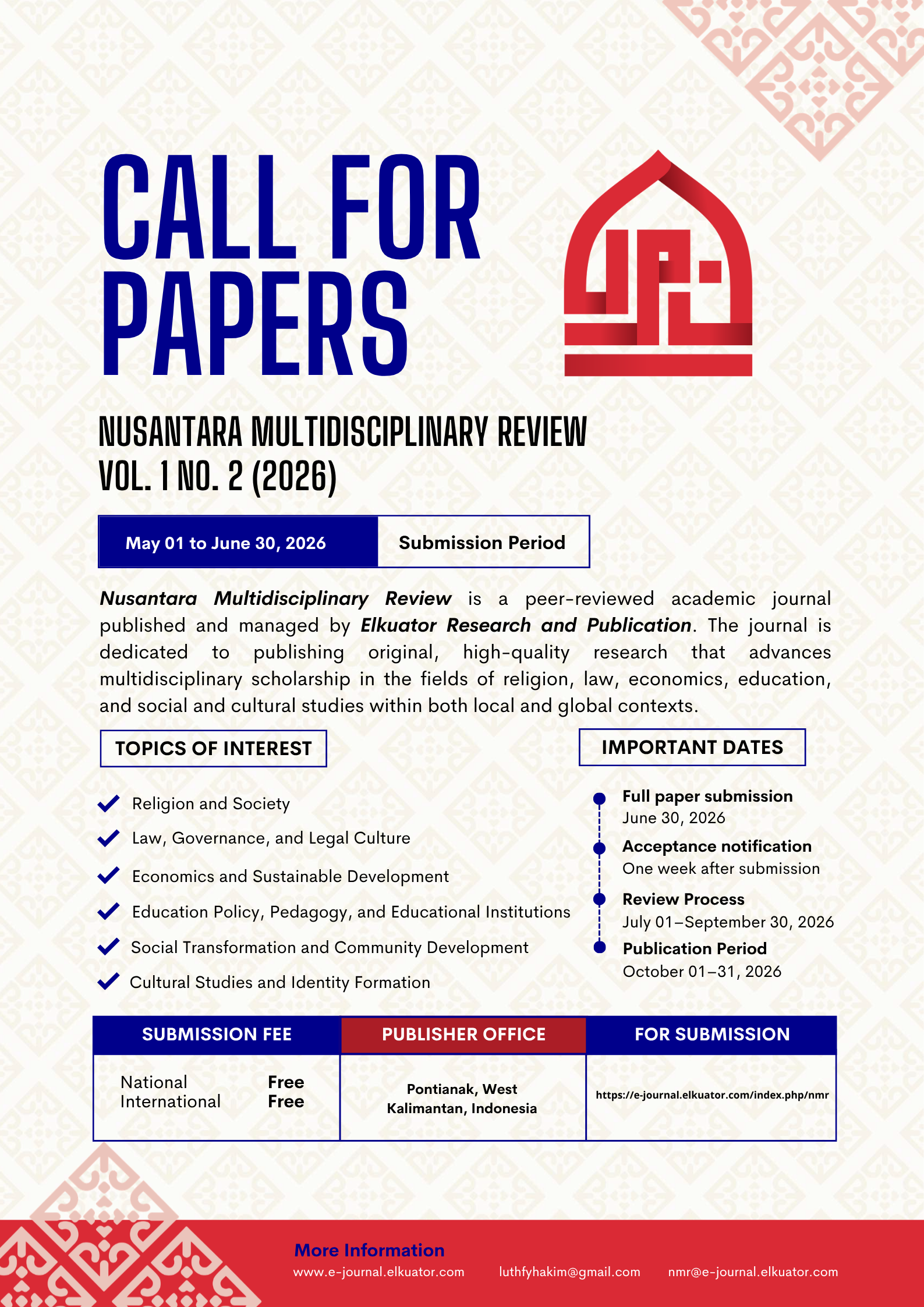 The Nusantara Multidisciplinary Review invites scholars, researchers, and practitioners to submit their best manuscripts for Vol. 1, No. 2, 2026. The journal publishes original, high-quality research that advances multidisciplinary scholarship in the fields of religion, law, economics, education, and social and cultural studies.